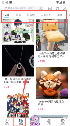 2、点击底部 “商城”,在商品页顶部可切换 “全部”“周边” 等分类,浏览不同类别的漫改商品。