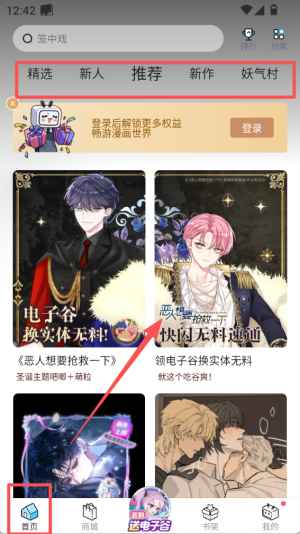 1、回到 “首页”,在顶部找到 “精选”“新人” 等标签,能看到领电子谷换实体无料的相关活动卡片。