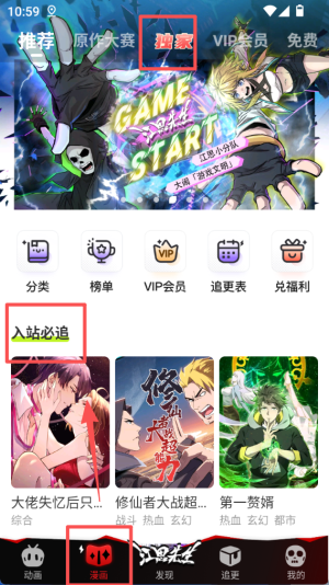 1、在顶部导航栏切换到 “独家” 板块,下方会呈现 “入站必追” 的推荐内容,可直接点击作品进入阅读页面。