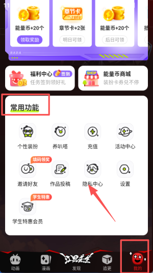 3、在 “我的” 页面展开 “常用功能” 区域,可找到 “隐私中心” 选项,点击后能进入相关设置界面调整隐私选项。