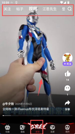 2、点击底部 “发现” 按钮并切换到 “视频” 标签,能浏览其他用户分享的内容,包含作品测评类的视频动态。