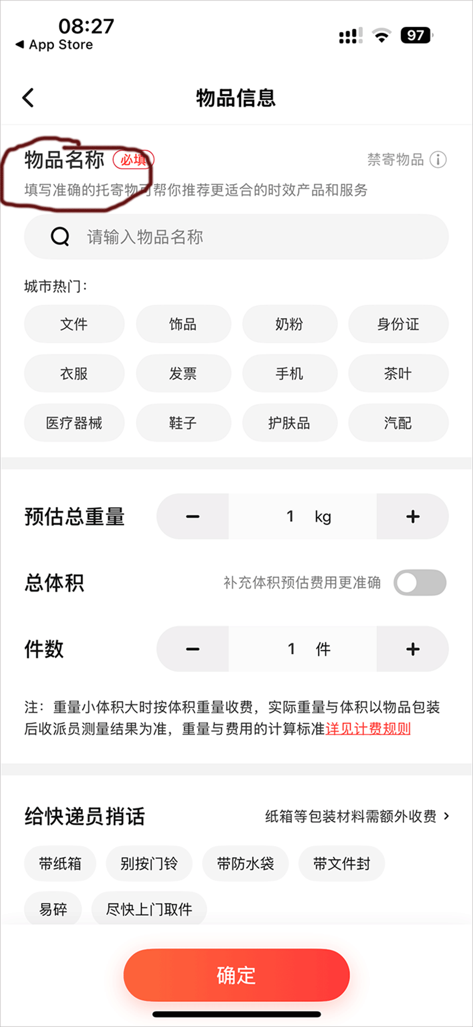 4、预约完时间,在跳出页面“物品”栏选择物品类型和重量,还有件数,还能给快递员捎话,点击“确定“即可