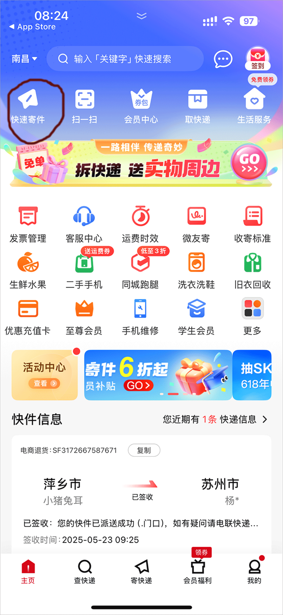 1、首先在本站下载顺丰速运app并打开软件,在首页,正中间有寄件记录以及物流信息,下方点击“我的”可以登录以及查看自己个人信息,寄件的话点击寄件按钮即可