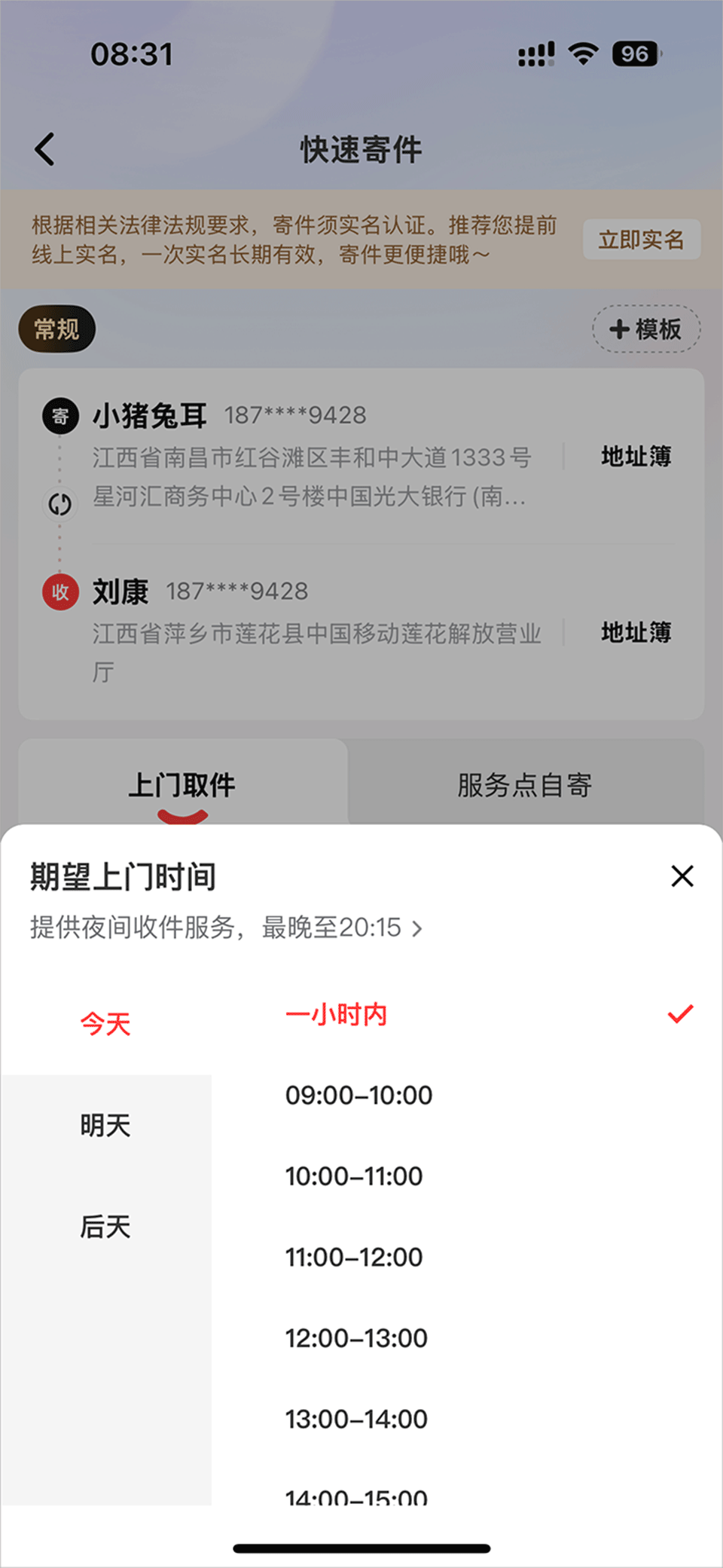3、点击输入寄件人地址按钮,同时也可以预约时间寄件