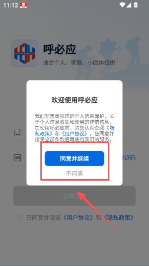 1、打开呼必应 APP,弹出隐私政策提示框,阅读后点击同意并继续按钮,进入版本选择页面。