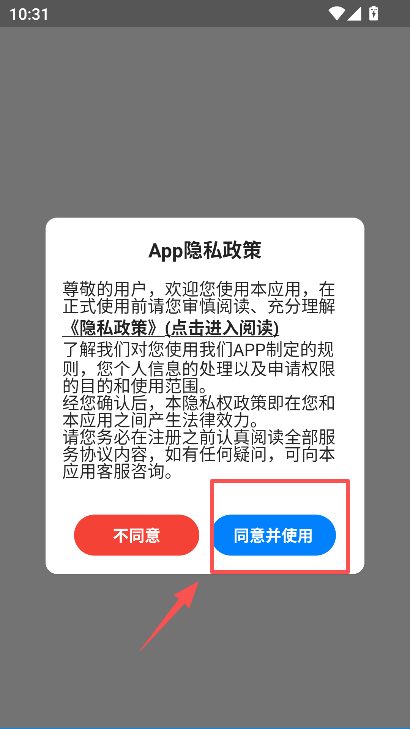 1、打开商家接单版 APP,弹出 App 隐私政策提示框,阅读内容后点击同意并使用按钮。