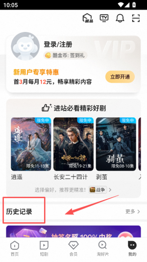 2、进入 “我的” 板块找到 “历史记录”,点击对应内容可直接续播,也能批量管理观看记录。