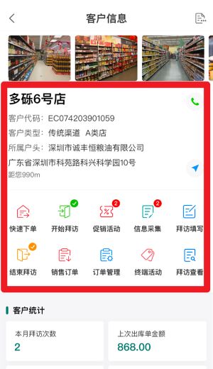 3、客户信息页展示客户地址、类型、拜访记录与促销活动等数据,便于业务员全面了解客户情况。