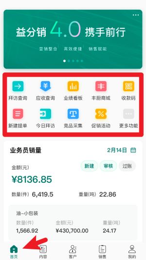 2、首页汇集拜访查询、应收账款、业绩看板等核心功能模块,方便业务员快速执行日常任务。