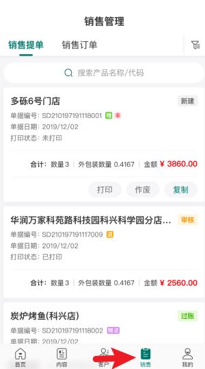 4、销售管理页面清晰列出销售提单与订单记录,支持快速查询、打印与复制等常用操作。