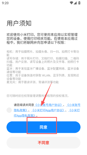 1、打开小米打印,在用户须知页面勾选同意相关协议,点击同意按钮,进入应用的欢迎界面。