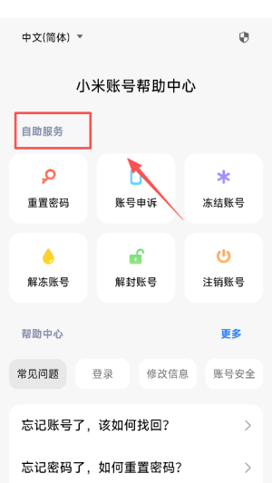 4、进入小米账号帮助中心,在自助服务板块,可使用重置密码账号申诉等功能,解决账号相关问题。