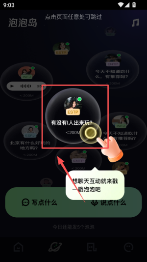 3、进入泡泡岛互动页面,点击任意位置跳过引导,再点击其他用户的泡泡内容,即可参与聊天互动。