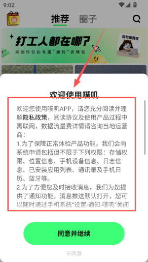 1、打开噗叽 APP,弹出隐私政策及权限说明页面,阅读相关内容后点击同意并继续,进入应用主界面。