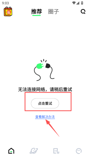 2、若遇到无法连接网络的提示,可点击重试按钮重新连接,也能查看解决办法来排除网络问题。