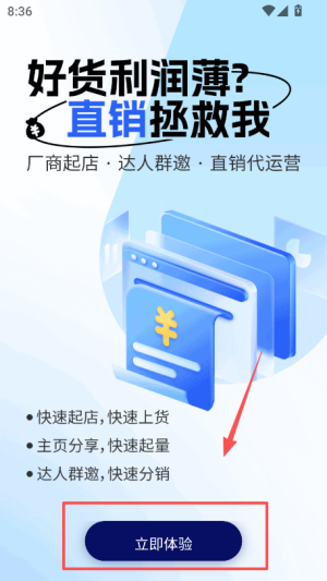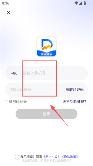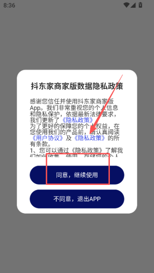 1、打开抖东家商家版,在弹出的隐私政策页面点击同意继续使用,进入引导页后点击立即体验,进入登录界面。