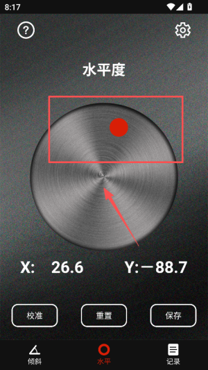 3、切换到水平度页面,查看 X 与 Y 轴的实时数值,利用下方的校准重置保存按钮,处理测量得到的数据。