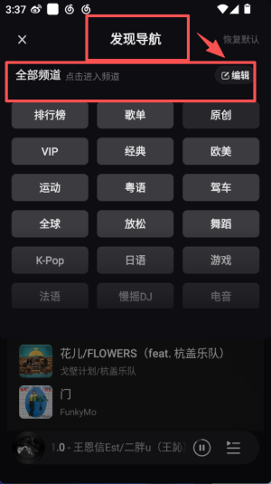 4、触发频道选择操作后,进入 “发现导航” 页面,能看到 “全部频道” 列表,包含排行榜、歌单等多个音乐分类频道。