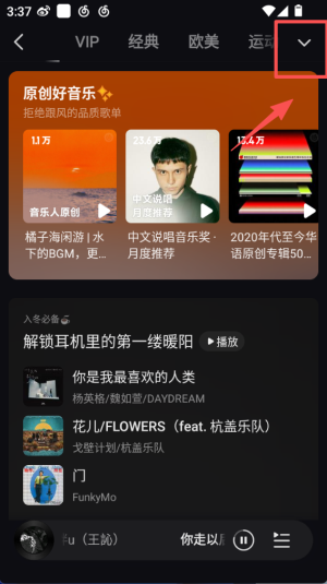 3、在音乐分类页面点击右上角下拉按钮,可切换到包含 “原创好音乐”“入冬必备” 等板块的页面,查看不同主题内容。