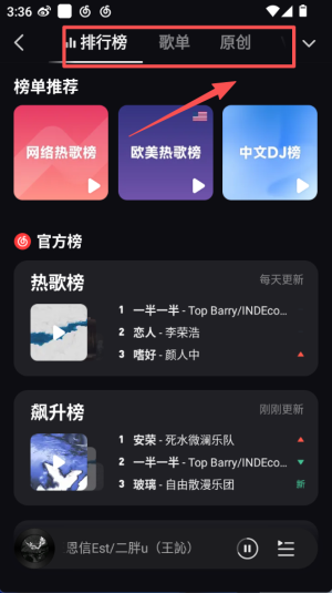 2、点击 “排行榜” 按钮进入对应页面,顶部有 “排行榜”“歌单”“原创” 选项卡,下方展示榜单推荐及官方榜单内容。
