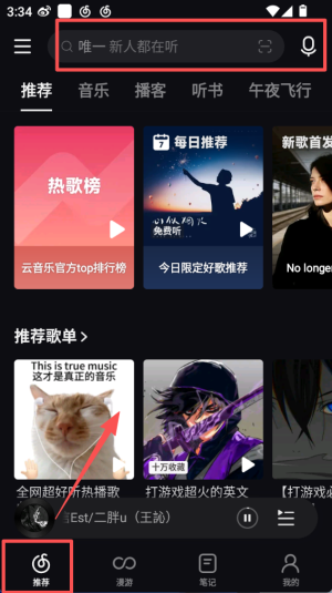 1、进入 “推荐” 页面,顶部有搜索栏可查找内容,下方展示热歌榜、每日推荐等板块,还有推荐歌单可供选择播放。