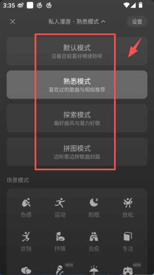 3、点击 “私人漫游熟悉模式” 区域,会展开模式选择菜单,包含默认、熟悉、探索、拼图等不同听歌模式选项。