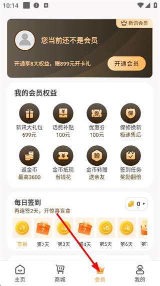 2、会员页面展示礼包与话费补贴等专属权益,支持每日签到获取连续奖励与惊喜盲盒。