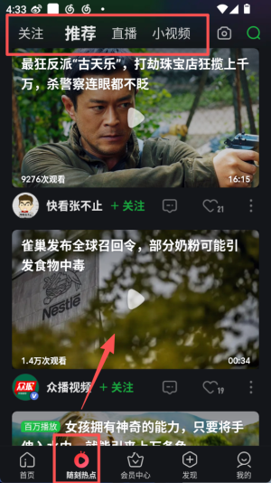 2、点击 “随刻热点”,进入后能看到关注、推荐等分类,展示各类短视频内容,可对喜欢的内容点击关注。