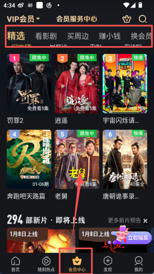 3、切换到会员中心页面,“精选” 板块展示罚罪 2、逍遥等作品,部分内容处于限免状态可直接观看。