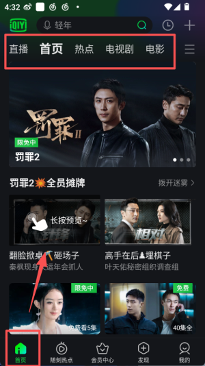 1、进入爱奇艺首页,顶部有直播、首页等频道选项,页面展示罚罪 2 等内容,可长按预览剧集片段。
