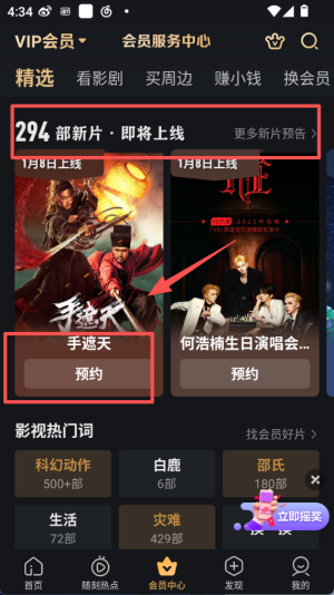 4、在会员中心的 “294 部新片・即将上线” 板块,找到手遮天等新片,点击 “预约” 按钮可预订观看。