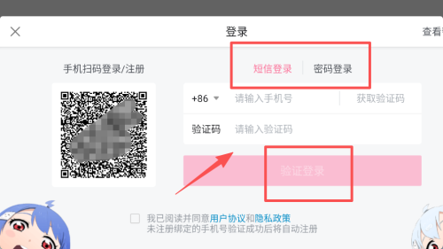 4、点击登录按钮后,进入登录界面,可选择短信或密码登录,输入手机号、验证码即可完成登录。