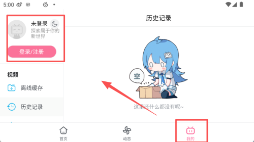 3、切换到 “我的” 页面,可看到登录注册入口,下方还有离线缓存、历史记录等功能选项。