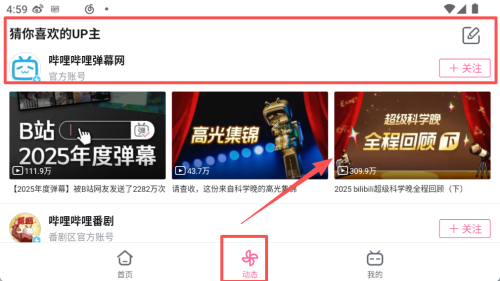 2、点击底部 “动态” 选项,进入后可查看推荐的 UP 主内容,还能浏览官方账号发布的专题内容。