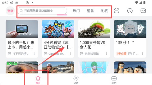 1、进入平台首页,顶部可切换热门、追番等分类,搜索栏能查找想看的内容,页面展示各类推荐视频。