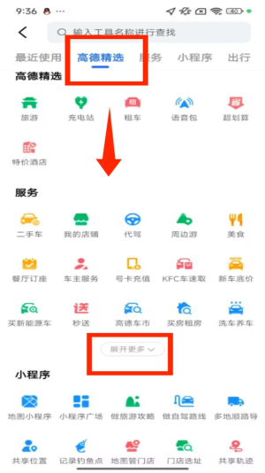 4、在工具页面切换到 “高德精选” 标签,点击 “展开更多”,能查看更多服务类功能入口,拓展使用场景。