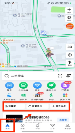 1、进入高德地图首页,可点击 “设置家”“设置单位” 按钮,添加常用地址,方便后续快速调用。
