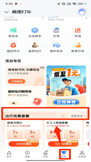 2、切换到 “打车” 板块,在 “出行优惠套餐” 区域,可查看并选购新人、打工人等不同类型的优惠套餐。