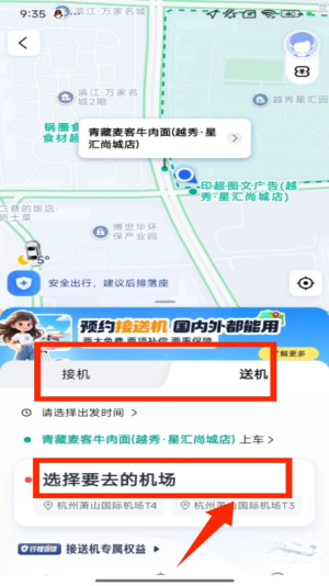 4、在接送机界面,选择 “接机” 或 “送机” 类型,再选定目标机场,即可发起对应的接送机用车请求。