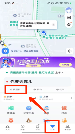 3、切换到 “打车” 板块,确认上车点后,点击 “接送机” 选项,可切换至接送机服务的操作界面。