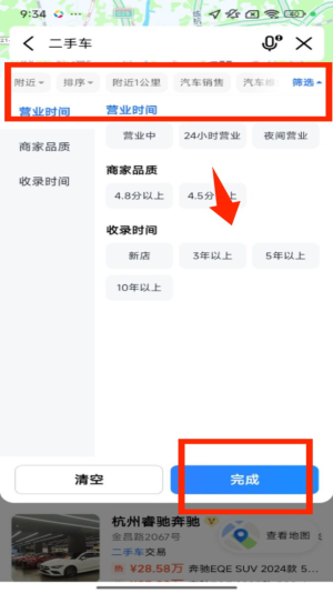 2、在二手车界面,可通过 “筛选” 按钮设置营业时间、商品品质等条件,选好后点击 “完成” 应用筛选。