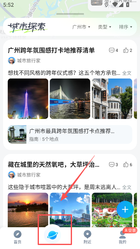 1、点击底部 “探索” 按钮进入城市探索页面,可查看当地打卡点推荐等生活类内容。