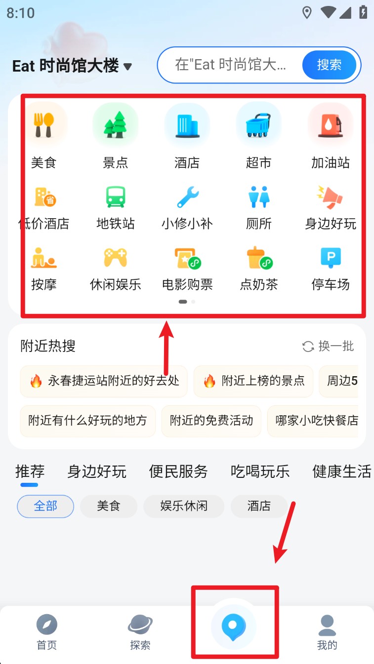 5. 点击下方“附近”栏目,可快速搜索周边美食、酒店、厕所、地铁站等生活场景服务。