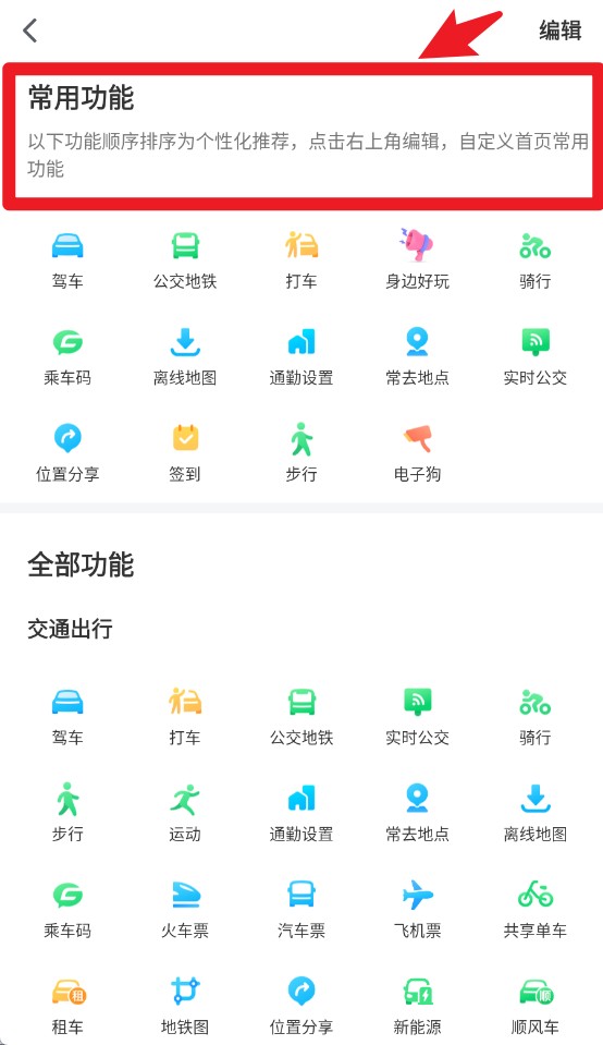 3、点击【首页-更多】可编辑常用功能,自定义首页显示的快捷出行服务。