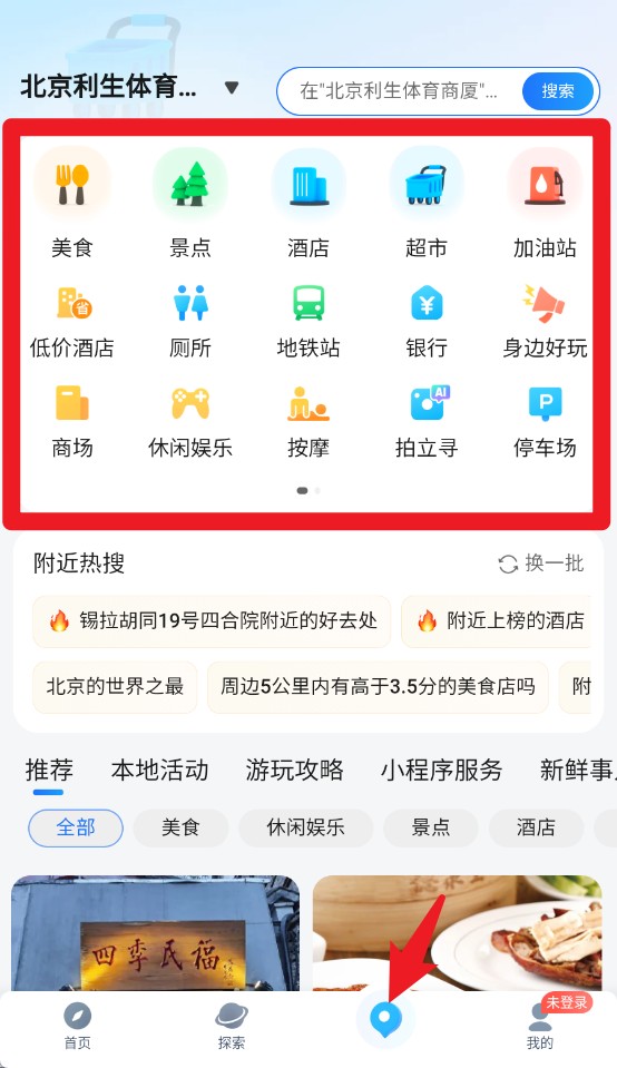 4、进入“附近”页面,快速查找周边美食、景点、酒店等生活信息。