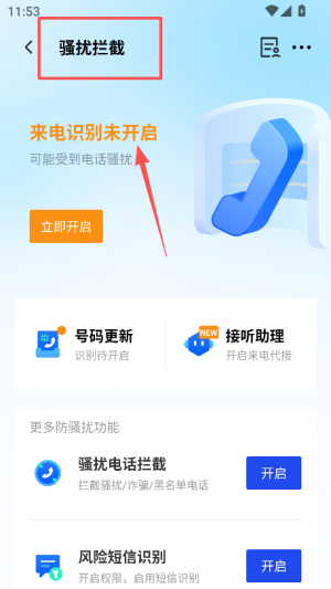 2、若来电识别未开启,可在页面中找到 “立即开启” 按钮,点击后完成功能的权限配置。