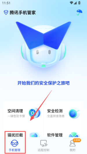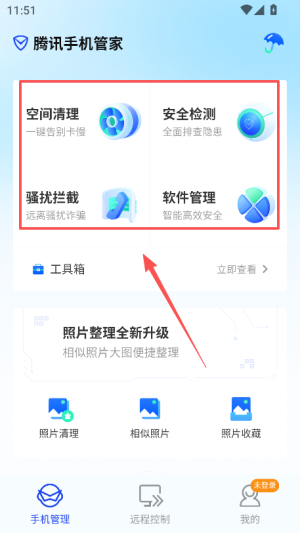 1、打开腾讯手机管家后,进入 “手机管理” 页面,能看到空间清理、安全检测等核心功能入口。