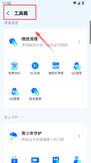2、点击页面中的 “工具箱” 选项,进入后可找到微信清理、免费 WiFi 等更多辅助工具。