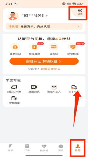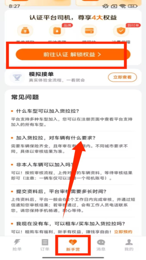 1、进入 “新手营” 页面,点击 “前往认证 解锁权益” 按钮,可进入司机认证流程,同时能查看常见问题说明。
