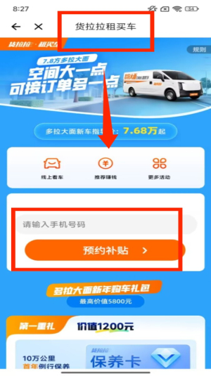 2、进入 “货拉拉租买车” 页面,填写手机号码后点击 “预约补贴”,可参与租购车相关的福利活动。